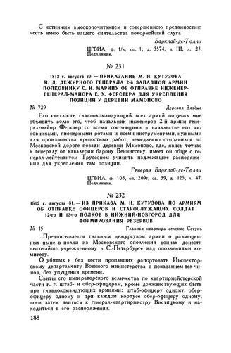 1812 г. августа 31. — Из приказа М.И. Кутузова по армиям об отправке офицеров и старослужащих солдат 12-го и 13-го полков в Нижний-Новгород для формирования резервов. Главная квартира селение Сетунь // ЦГВИА, ф. ВУА, д. 3524, лл. 12-13. Подлинник. Опублик. в сб. «Отечественная война 1812 г. Материалы ВУА», т. XVI, СПБ, 1911, стр. 143.