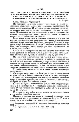 1812 г. августа 31. — Рескрипт Александра I М.И. Кутузову с приложением плана действий против французских войск для армий А.П. Тормасова и П.В. Чичагова и корпусов П.X. Витгенштейна и Ф.Ф. Штейнгеля. С.-Петербург // ЦГВИА, ф. ВУА, д. 453, лл. 16-17 об. Подлинник. Опублик. в «Сборнике исторических материалов, извлеченных из архива собственной е. и. в. канцелярии», вып. 1, СПБ, 1876, стр. 80-82, и в сб. «Отечественная война 1812 г. Материалы ВУА», т. XVI, СПБ, 1911, стр. 201-202.