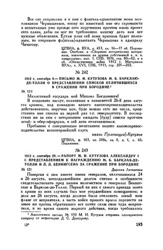 1812 г. сентября 29. — Рапорт М.И. Кутузова Александру I с представлением к награждению М.Б. Барклая-де-Толли и Л.Л. Беннигсена за сражение при Бородине. Деревня Леташевка // ЦГВИА, ф. 29, оп. 153а, св. 12, д. 1223, лл.1-2. Подлинник. Опублик. в журн. «Военный сборник», 1904, № 4, стр. 185-186.