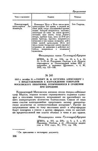 1812 г. октября 31. — Рапорт М.И. Кутузова Александру I с представлением к награждению генералов Московского ополчения, отличившихся в сражении при Бородине // ЦГВИА, ф. 103, оп. 208а, св. 0, д. 3, л. 67. Подлинник. Опублик. в сб. «Московское дворянство в 1812 году». М., 1912, стр. 146.