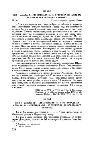 1812 г. сентября 3. — Из приказа М.И. Кутузова по армиям о наведении порядка в обозах. Главная квартира деревня Панки // ЦГВИА, ф. ВУА, д. 3524, лл. 13-14. Подлинник. Опублик. в сб. «Отечественная война 1812 г. Материалы ВУА», т. XVIII, СПБ, 1911, стр. 15-16.