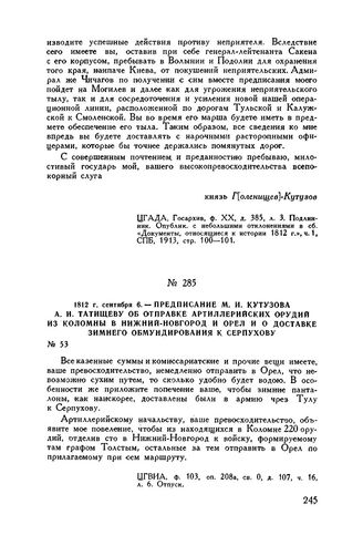1812 г. сентября 6. — Предписание М.И. Кутузова А.И. Татищеву об отправке артиллерийских орудий из Коломны в Нижний Новгород и Орел и о доставке зимнего обмундирования к Серпухову