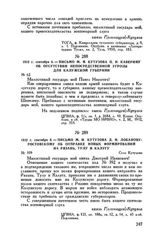 1812 г. сентября 6. — Письмо М.И. Кутузова П.Н. Каверину об отсутствии непосредственной угрозы для Калужской губернии // ЦГВИА, ф. 1/л, оп. 1, д. 2684, л. 10. Копия. Опублик. в сб. «Труды МО ИРВИО», т. 2, М., 1912, стр. 353.