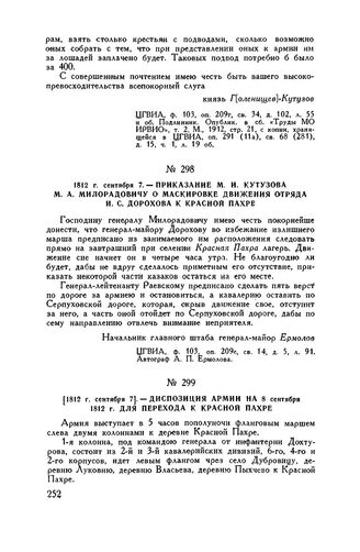 1812 г. сентября 7. — Приказание М.И. Кутузова М.А. Милорадовичу о маскировке движения отряда И.С. Дорохова к Красной Пахре // ЦГВИА, ф. 103, оп. 209е, св. 14, д. 5, л. 91.