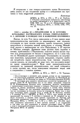 1812 г. сентября 8. — Предписание М.И. Кутузова начальнику партизанского отряда генерал-майору И.С. Дорохову о разведке сил и намерений противника // ЦГВИА, ф. ВУА, д. 3463 3, л. 52. Черновик.