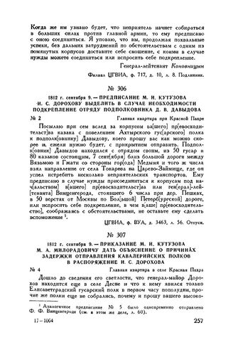 1812 г. сентября 9. — Предписание М.И. Кутузова И.С. Дорохову выделить в случае необходимости подкрепление отряду подполковника Д.В. Давыдова. Главная квартира при Красной Пахре