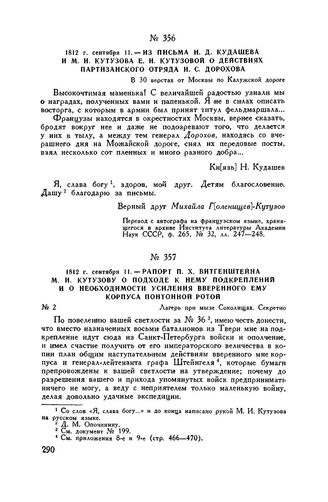 1812 г. сентября 11. — Из письма Н.Д. Кудашева и М.И. Кутузова Е.И. Кутузовой о действиях партизанского отряда И.С. Дорохова. В 30 верстах от Москвы по Калужской дороге // Архив Института литературы Академии Наук СССР, ф. 263, № 32, лл. 247-248. Перевод с автографа на французском языке.