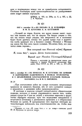 1812 г. сентября 20. — Из приказа М.И. Кутузова по армиям о запрещении задерживать в полках транспорты и с объявлением благодарности казачьим полкам Балабина 2-го и И.Е. Ефремова // ЦГВИА, ф. ВУА, д. 3524, лл. 29-31. Подлинник. Опублик. в сб. «Отечественная война 1812 г. Материалы ВУА», т. XVIII, СПБ, 1911, стр. 94-95.