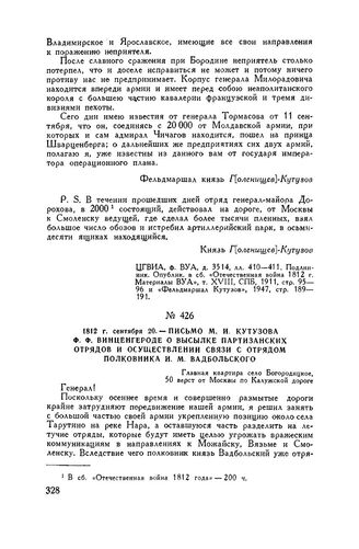 1812 г. сентября 20. — Письмо М.И. Кутузова Ф.Ф. Винценгероде о высылке партизанских отрядов и осуществлении связи с отрядом полковника И.М. Вадбольского. Главная квартира село Богородицкое, 50 верст от Москвы по Калужской дороге // ЦГВИА, ф. 341, д. 82, л. 87 и об. Перевод с копии на французском языке.