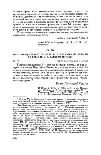1812 г. сентября 21. — Из приказа М.И. Кутузова по армиям об отъезде М.Б. Барклая-де-Толли. Главная квартира село Тарутино // ЦГВИА, ф. ВУА, д. 3524, л. 31 и об. Подлинник. Опублик. в сб. «Отечественная война 1812 г. Материалы ВУА», т. XVIII, СПБ, 1911, стр. 103 и в сб. «Фельдмаршал Кутузов», 1947, стр. 191.