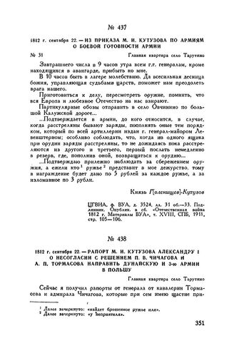 1812 г. сентября 22. — Рапорт М.И. Кутузова Александру I о несогласии с решением П.В. Чичагова и А.П. Тормасова направить Дунайскую и 3-ю армии в Польшу. Главная квартира село Тарутино // ЦГИАЛ, ф. 1409, оп. 1, д. 710, ч. 1, лл. 7-8. Подлинник. Опублик. в «Сборнике исторических материалов, извлеченных из архива собственной е. и. в. канцелярии», вып. X, СПБ, 1898, стр. 45.
