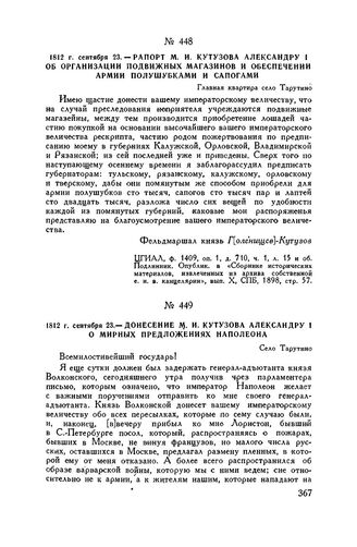 1812 г. сентября 23. — Донесение М.И. Кутузова Александру I о мирных предложениях Наполеона. Село Тарутино // ЦГВИА, ф. ВУА, д. 1078, лл. 157-158 об. Подлинник. Опублик. в сб. «Отечественная война 1812 г. Материалы ВУА», т. XVIII, СПБ, 1911, стр. 108-109; т. XIX, СПБ, 1912, стр. 379-380 и в сб. «Фельдмаршал Кутузов», 1947, стр. 191-193. Частично опублик. в кн. А.И. Михайловский-Данилевский, «Описание Отечественной войны в 1812 году», ч. III, СПБ, 1839, стр. 86-87.