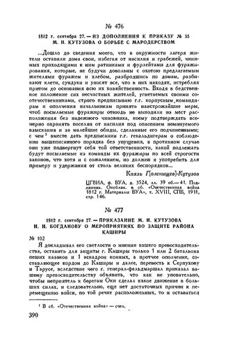 1812 г. сентября 27. — Приказание М.И. Кутузова Н.И. Богданову о мероприятиях по защите района Каширы // ЦГВИА, ф. ВУА, д. 3521, л. 10 об. Копия. Опублик. в сб. «Отечественная война 1812 г. Материалы ВУА», т. XVIII, СПБ, 1911, стр. 9.