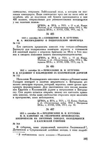 1812 г. сентября 28. — Предписание М.И. Кутузова П.Н. Каверину об увеличении производства боеприпасов на литейных заводах, находящихся в Калужской губернии // ЦГВИА, оп. 291 (11а), св. 68 (281), д. 15, ч. 1, лл. 73-74. Копия. Опублик. в сб. «Труды МО ИРВИО», т. 2. М., 1912, стр. 67.