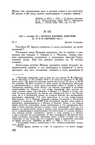 1812 г. сентября 30. — Журнал военных действий за 29 и 30 сентября 1812 г. Деревня Леташевка // ЦГИАЛ, ф. 1409, оп. 1, д. 649, лл. 28-31 об. Подлинник. Опублик. частично со значительными отклонениями в прибавлении к газ. «Санктпетербургские ведомости», 15 октября 1812 г., № 83, полностью в «Сборнике исторических материалов, извлеченных из архива собственной е. и. в. канцелярии», вып. XIII, СПБ, 1906, стр. 16-18.