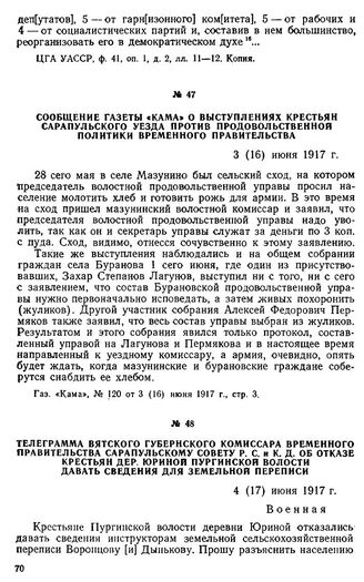 Сообщение газеты «Кама» о выступлениях крестьян Сарапульского уезда против продовольственной политики Временного правительства. 3 (16) июня 1917 г. // Газ. «Кама», № 120 от 3 (16) июня 1917 г., стр. 3.