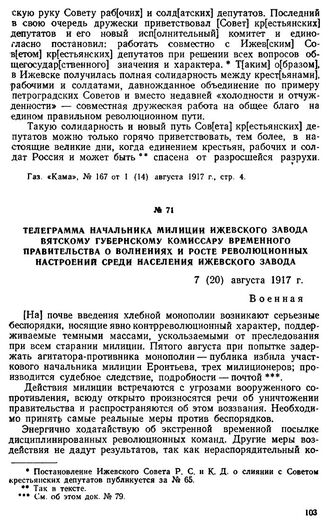 Телеграмма начальника милиции Ижевского завода Вятскому губернскому комиссару Временного правительства о волнениях и росте революционных настроении среди населения Ижевского завода. 7 (20) августа 1917 г.