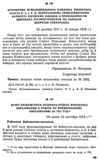Отчет Елабужского уездного отдела народного образования о работе по внешкольному образованию за 1917 год. Не ранее 12 сентября 1918 г. // ГАКО, ф. 1137, оп. 1, д. 44, лл. 1—3. Подлинник.