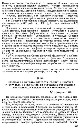 Резолюция митинга матросов, солдат и рабочих г. Сарапула об изгнании из городских учреждении приспешников буржуазии и саботажников. 15 (2) февраля 1918 г. // Газ. «Воля», № 23 от 19(6) февраля 1918 г., стр. 4.