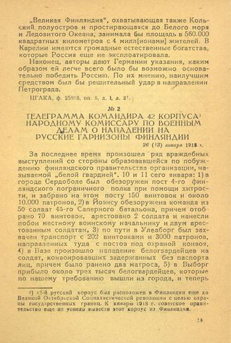 Телеграмма командира 42 корпуса народному комиссару по военным делам о нападении на русские гарнизоны Финляндии. 26 (13) января 1918 г. // ЦГАКА, д. [531], лл. 9-10.