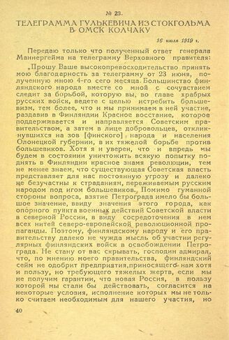 Телеграмма Гулькевича из Стокгольма в Омск Колчаку. 16 июля 1919 г. // «Красный Архив», т. 1 (98). стр. 63-64.