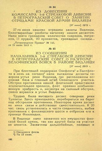 Из сообщения начальника 1-й стрелковой дивизии в Петроградский совет о разгроме белофинских войск в районе Видлицы. [27 июня] 1919 г. // «Петроградская Правда», № 143, от 29 июня 1919 г.