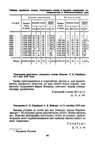 Таблица промытых песков, полученного золота и среднего содержания золота на сто пудов песку на приисках Ленского золотопромышленного товарищества и «Иннокентьевского дела барона Гинцбурга» за 1868—1872 годы