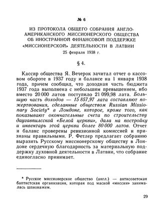Из протокола общего собрания Англо-Американского миссионерского общества об иностранной финансовой поддержке «миссионерской» деятельности в Латвии. 25 февраля 1938 г.