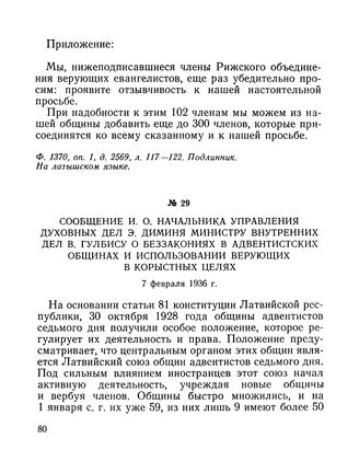 Сообщение и. о. начальника Управления духовных дел Э. Диминя министру внутренних дел В. Гулбису о беззакониях в адвентистских общинах и использовании верующих в корыстных целях. 7 февраля 1936 г. // Ф. 1370, оп. 1, д. 2607, л. 146-148. Подлинник.