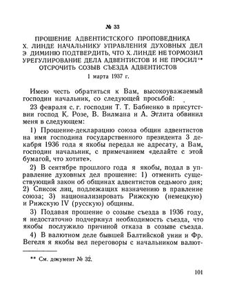 Прошение адвентистского проповедника X. Линде начальнику Управления духовных дел Э. Диминю подтвердить, что X. Линде не тормозил урегулирование дела адвентистов и не просил отсрочить созыв съезда адвентистов. 1 марта 1937 г.