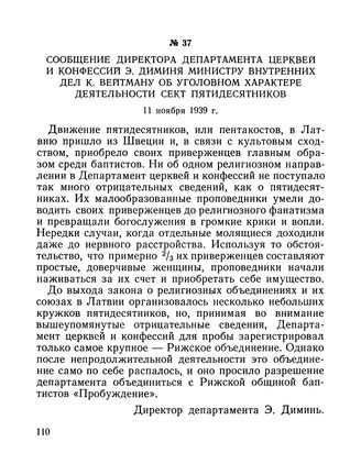 Сообщение директора Департамента церквей и конфессий Э. Диминя министру внутренних дел К. Бейтману об уголовном характере деятельности сект пятидесятников. 11 ноября 1939 г.