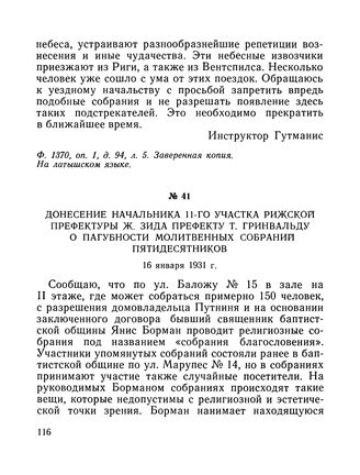 Донесение начальника 11-го участка Рижской префектуры Ж. Зида префекту Т. Гринвальду о пагубности молитвенных собраний пятидесятников. 16 января 1931 г.