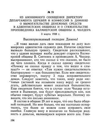 Из анонимного сообщения директору Департамента церквей и конфессий Э. Диминю о вымогательстве денежных средств в адвентистских общинах и о стяжательстве проповедника Валмиерской общины А. Чолдера. 3 марта 1938 г.
