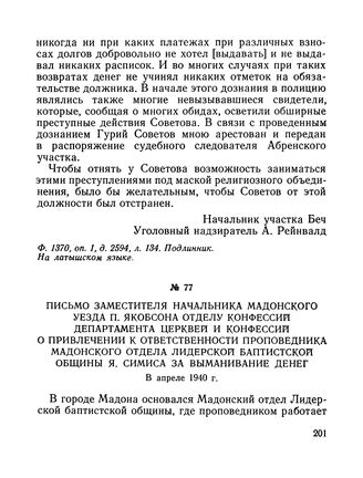 Письмо заместителя начальника Мадонского уезда П. Якобсона отделу конфессий Департамента церквей и конфессий о привлечении к ответственности проповедника Мадонского отдела Лидерской баптистской общины Я. Симиса за выманивание денег. Апрель 1940 г.