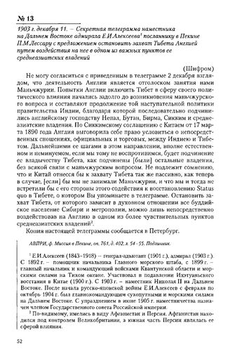 1903 г. декабря 11. - Секретная телеграмма наместника на Дальнем Востоке адмирала Е.И. Алексеева посланнику в Пекине П.М. Лессару с предложением остановить захват Тибета Англией путем воздействия на нее в одном из важных пунктов ее среднеазиатских владений // АВПРИ, ф. Миссия в Пекине, oп. 761, д. 402, л. 54-55. Подлинник.