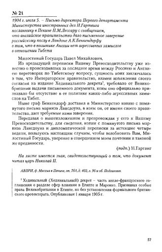 1904 г. июля 5. - Письмо директора Первого департамента Министерства иностранных дел Н. Гартвига посланнику в Пекине П.М. Лессару с сообщением, что английское правительство дало письменное заверение российскому послу в Лондоне А.К. Бенкендорфу в том, что в политике Англии нет агрессивных замыслов в отношении Тибета // АВПРИ, ф. Миссия в Пекине, oп. 761, д. 402, л. 96 и об. Подлинник.