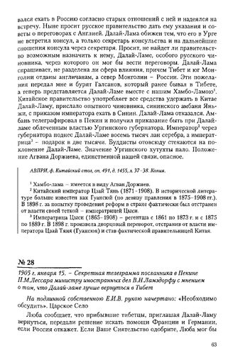 1905 г. января 15. - Секретная телеграмма посланника в Пекине П.М. Лессара министру иностранных дел В.Н. Ламздорфу с мнением о том, что Далай-ламе лучше вернуться в Тибет // АВПРИ, ф. Китайский стол, оп. 491, д. 1455, л. 34. Копия.