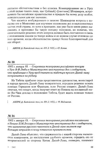 1905 г. января 18. - Секретная телеграмма российского консула в Урге В.Ф. Любы в Министерство иностранных дел с сообщением, что прибывшие в Ургу представители тибетцев просят Далай-ламу возвратиться на родину