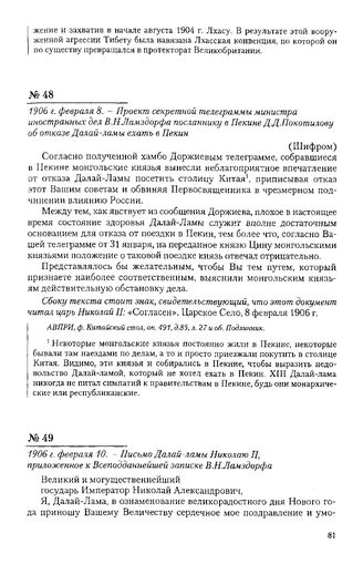 1906 г. февраля 10. - Письмо Далай-ламы Николаю II, приложенное к Всеподданнейшей записке В.Н. Ламздорфа // АВПРИ, ф. Китайский стол, oп. 491, д. 85, л. 36. Подлинник. Перевод с тибетского языка, современный подлиннику.