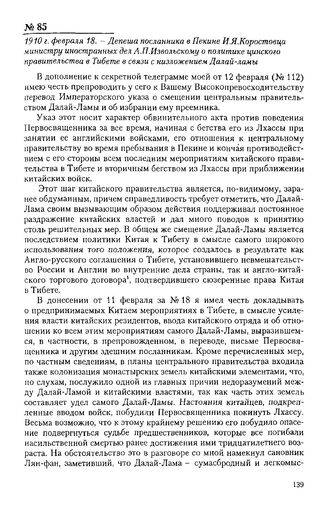 1910 г. февраля 18. - Депеша посланника в Пекине И.Я. Коростовца министру иностранных дел А.П. Извольскому о политике цинского правительства в Тибете в связи с низложением Далай-ламы // АВПРИ, ф. Китайский стол, oп. 491, д. 1458, л. 50-51 и об. Подлинник.