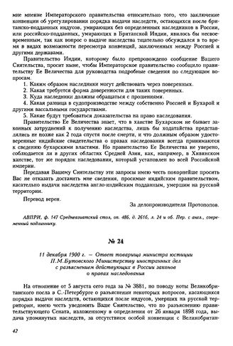 11 декабря 1900 г. — Ответ товарища министра юстиции П.М. Бутовского Министерству иностранных дел с разъяснением действующих в России законов о правах наследования // АВПРИ, ф. 147 Среднеазиатский стол, оп. 486, д. 261б, л. 30 об., 31. Подлинник.