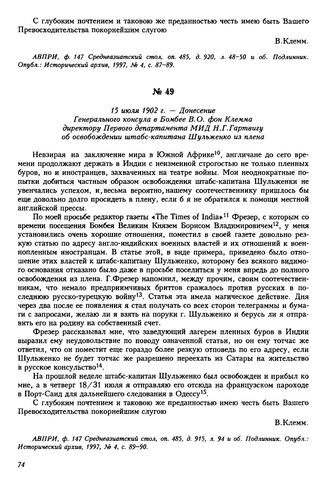 15 июля 1902 г. — Донесение Генерального консула в Бомбее В.О. фон Клемма директору Первого департамента МИД Н.Г. Гартвигу об освобождении штабс-капитана Шульженко из плена