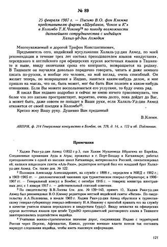 25 февраля 1907 г. — Письмо В.О. фон Клемма представителю фирмы «Щербаков, Чоков и К°» в Коломбо Т.К. Чокову по поводу возможности дальнейшего сотрудничества с индийцем Халил-уд-дин Ахмедом
