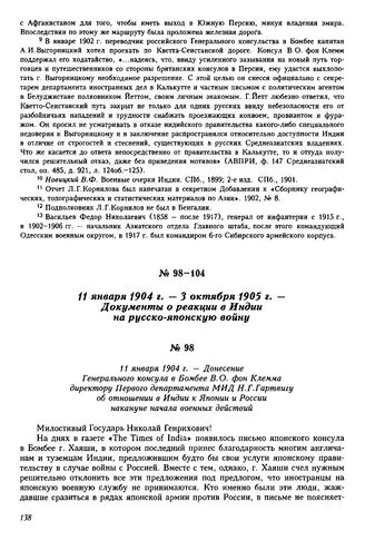 11 января 1904 г. — Донесение Генерального консула в Бомбее В.О. фон Клемма директору Первого департамента МИД Н.Г. Гартвигу об отношении в Индии к Японии и России накануне начала военных действий // АВПРИ, ф. 147 Среднеазиатский стол, оп. 485, д. 927, л. 14-15 и об. Подлинник.