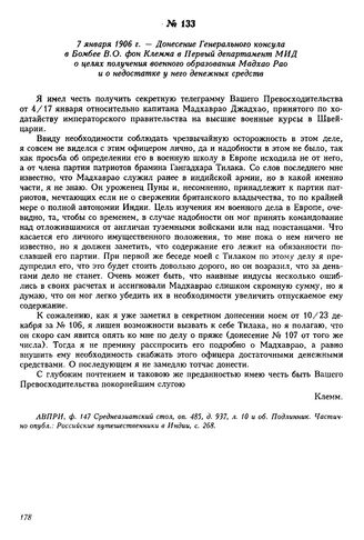 7 января 1906 г. — Донесение Генерального консула в Бомбее В.О. фон Клемма в Первый департамент МИД о целях получения военного образования Мадхао Рао и о недостатке у него денежных средств // АВПРИ, ф. 147 Среднеазиатский стол, оп. 485, д. 937, л. 10 и об. Подлинник. Частично опубл.: Российские путешественники в Индии, с. 268.