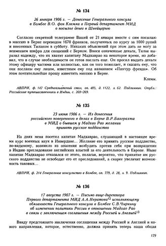 26 января 1906 г. — Донесение Генерального консула в Бомбее В.О. фон Клемма в Первый департамент МИД о посылке денег в Швейцарию // АВПРИ, ф. 147 Среднеазиатский стол, оп. 485, д. 1122, л. 62. Подлинник. Опубл.: Российские путешественники в Индии, с. 268-269.