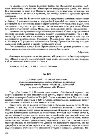 31 января 1906 г. — Отзыв начальника военно-статистического отдела Главного управления Генерального штаба генерал-майора Н.С. Ермолова на книгу Н. Нотовича «По Индии» // РГВИА, ф. 2000, оп. 1, д. 969, л. 147 и об. Подлинник.