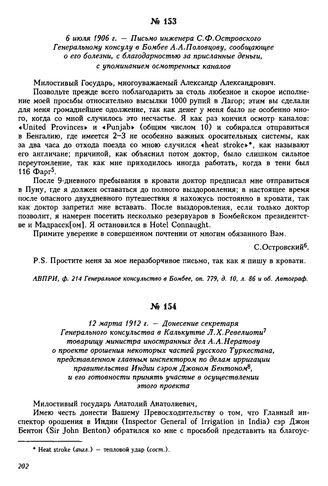 6 июля 1906 г. — Письмо инженера С.Ф. Островского Генеральному консулу в Бомбее А.А. Половцову, сообщающее о его болезни, с благодарностью за присланные деньги, с упоминанием осмотренных каналов