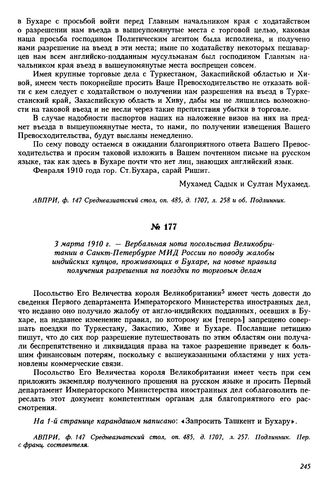 3 марта 1910 г. — Вербальная нота посольства Великобритании в Санкт-Петербурге МИД России по поводу жалобы индийских купцов, проживающих в Бухаре, на новые правила получения разрешения на поездки по торговым делам // АВПРИ, ф. 147 Среднеазиатский стол, оп. 485, д. 1707, л. 257. Подлинник.