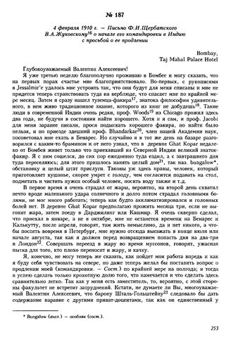 4 февраля 1910 г. — Письмо Ф.И. Щербатского В.А. Жуковскому о начале его командировки в Индию с просьбой о ее продлении. Bombay // Архив востоковедов СПбФ ИВ РАН, ф. 17, д. 10, л. 126-128. Опубл.: Российские путешественники в Индии, с. 290-292.